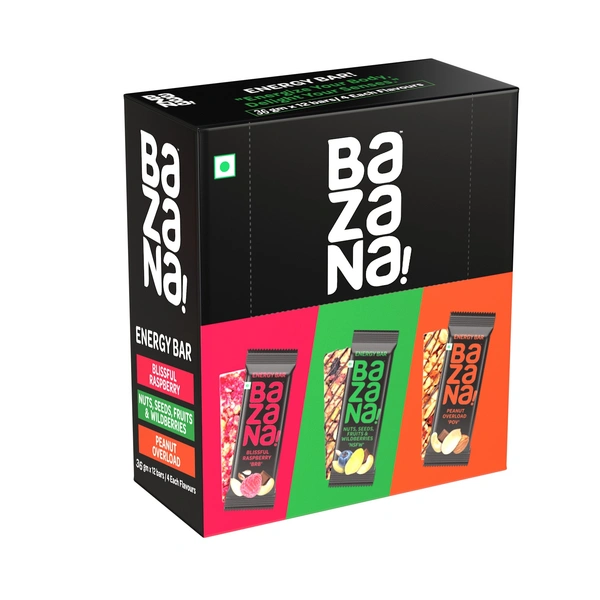 Bazana 3 in 1 Energy Bars | Trio Pack with 4 Units of Peanuts Overloaded (POV), Nuts, Seeds, Fruits & Wildberries (NSFW) and Blissful Raspberry (BRB) Energy Bars | (38g x 12 Bars)
