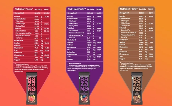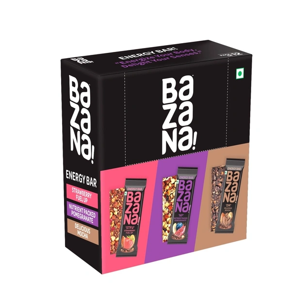 Bazana 3 in 1 Energy Bars | Trio Pack with 4 Units of Strawberry (STFU), Pomegranate (NP) and Mocha (DM) Energy Bars | (38g x 12 Bars)