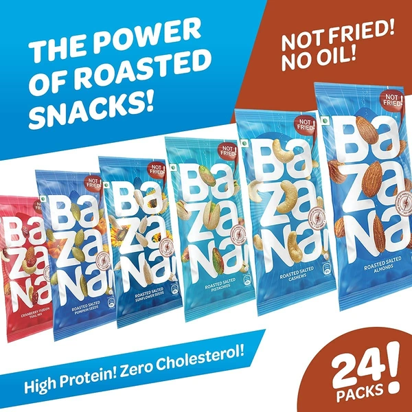 Bazana Combo Pack - Roasted Salted Almonds, Cashews, Pistachios, Cranberry Fusion Trail Mix, Sunflower & Pumpkin Seeds| 4 Units Each, Pack of 24