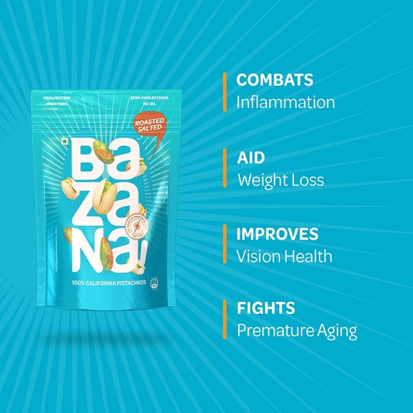 Introducing Bazana Roasted Salted Pistachios, the ultimate healthy and delicious roasted snack. Each pack contains 180g of premium, zero-oil roasted pistachios, carefully crafted to deliver the perfect balance of flavor and crunch.